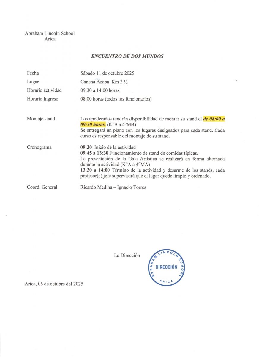 Se informa a la comunidad escolar que el miércoles 01 de octubre a las 18:00 horas se realizará un Consejo Administrativo con la participación de todos los funcionarios, por esta razón el 01.10.2025 los estudiantes de la jornada de la tarde se retiran a las 17:15 horas.