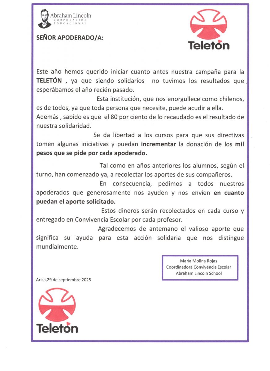 Titulo: CAMPAÑA TELETÓN 2025Autor: LA DIRECCIÓNFecha: 29-09-2025 Opciones... Volver al principio